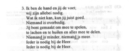 1e Lezing: Deuteronomium 10:12-22 (NBV) Psalm 15: 1, 3 en 4 Wie zult Gij noden in uw tent 2e Lezing: Marcus 7: 1-23 (NBV) NLB 912: 1, 4 en 5 – Neem mijn leven laat het, Heer Verkondiging – NLB 906: 1, 7 en 8 God is tegenwoordig Dankzegging en voorbeden, stil gebed en Onze Vader (NBV versie) Mededelingen ouderling van dienst Kinderen komen terug Inzameling der gaven Slotlied NLB 903: 1, 2, 5 en 6 Zou ik niet van harte zingen Zegen beantwoord met ‘Zing Amen’ ![]() ![]() |